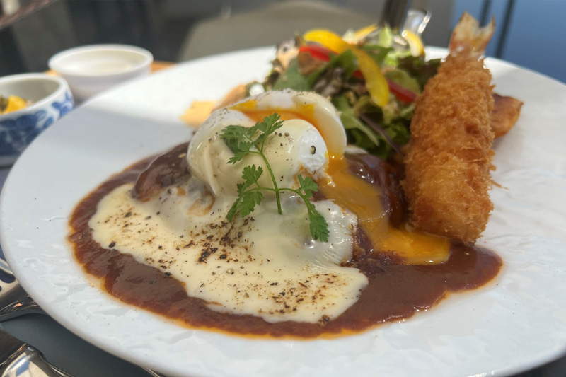 とろりと溶け出すポーチドエッグとチーズが濃厚な味わい。人気の海老フライ付き。